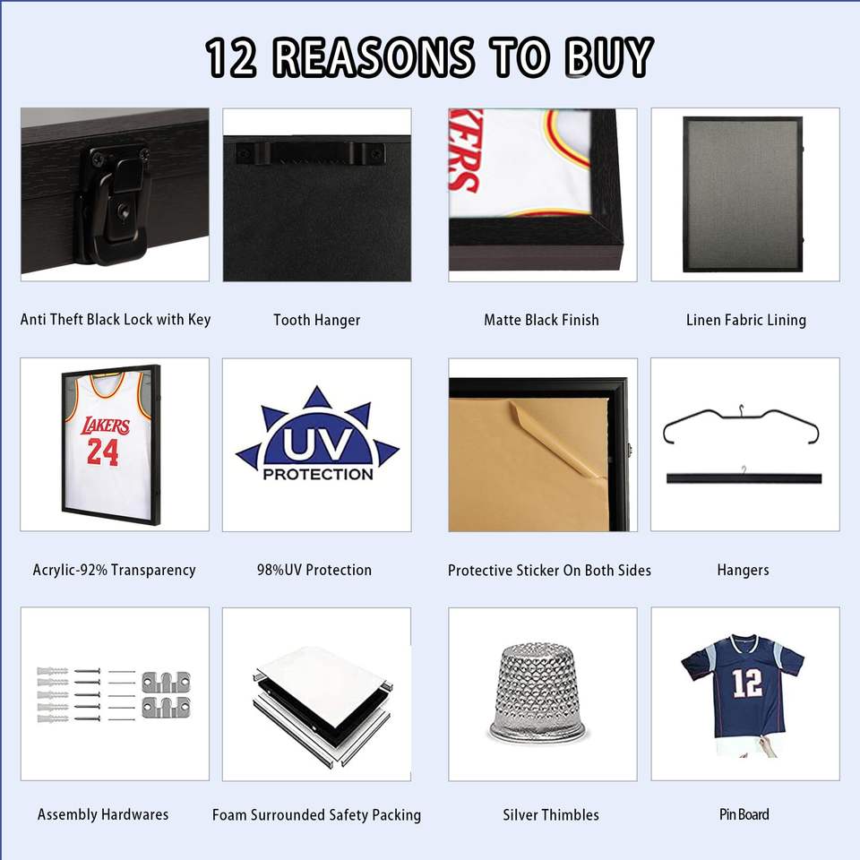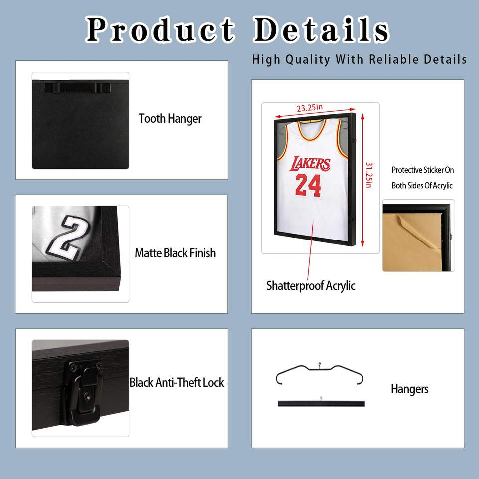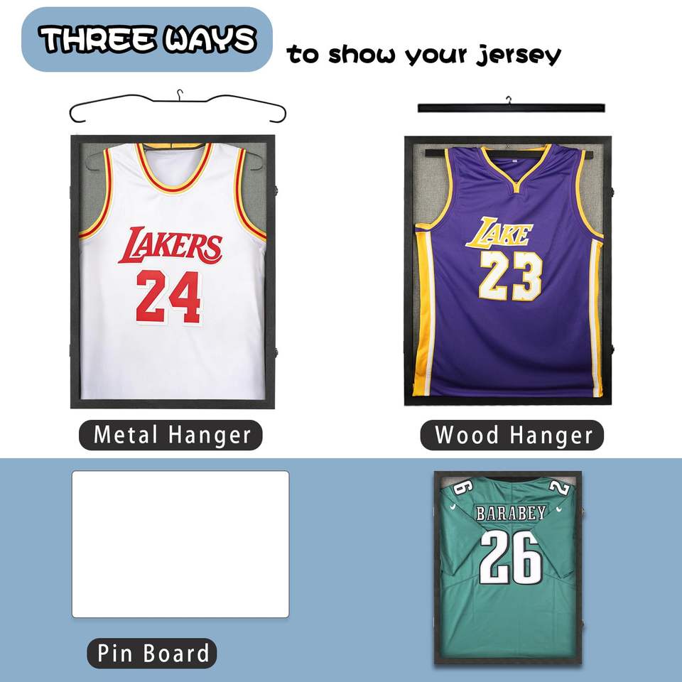Black Jersey Display Frame Lockable UV Acrylic with Linen Lining 3 Display Methods for Basketball Football Jerseys
