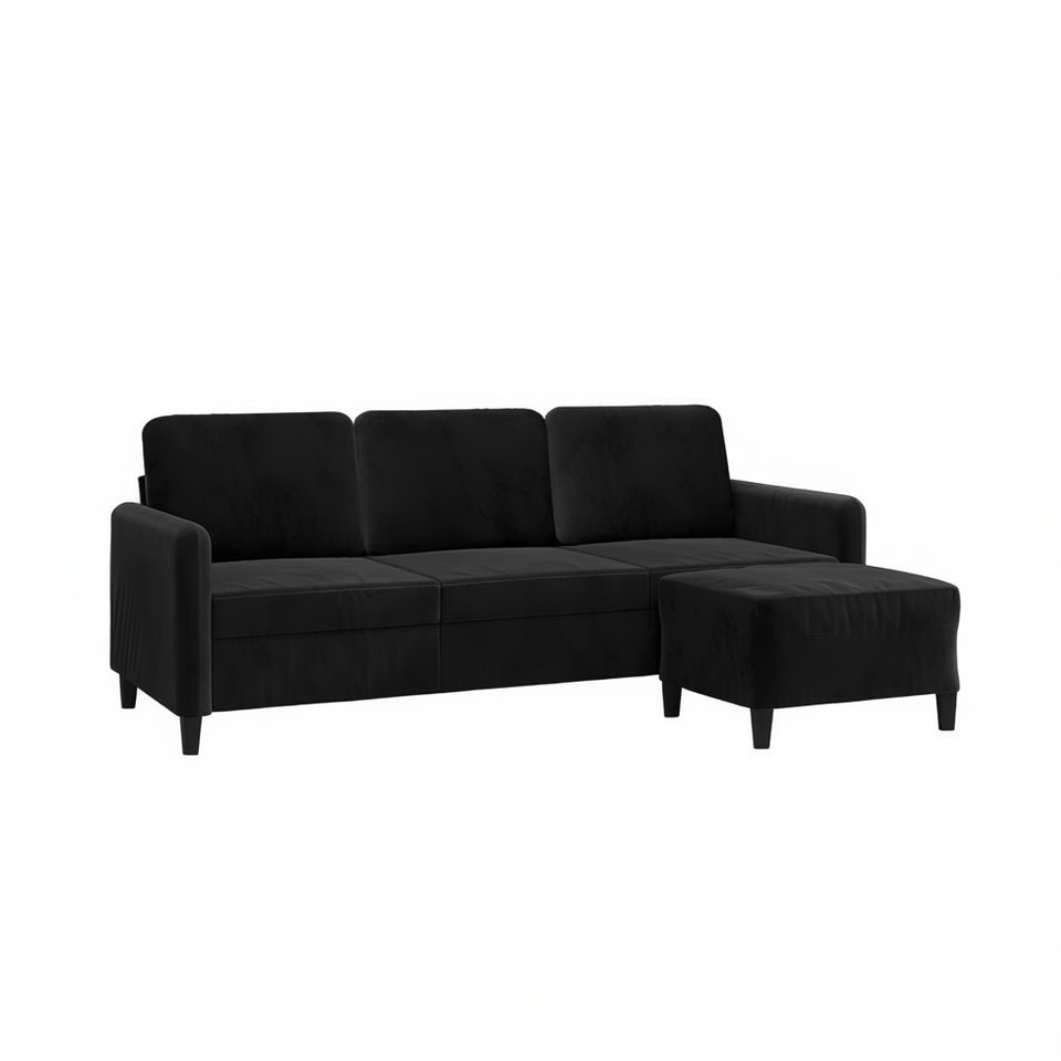 Black L-Shaped Sectional Sofa With Footstool Velvet Modern Living Room Furniture 3 Seater Cushion Back Padded Arms Wood Legs