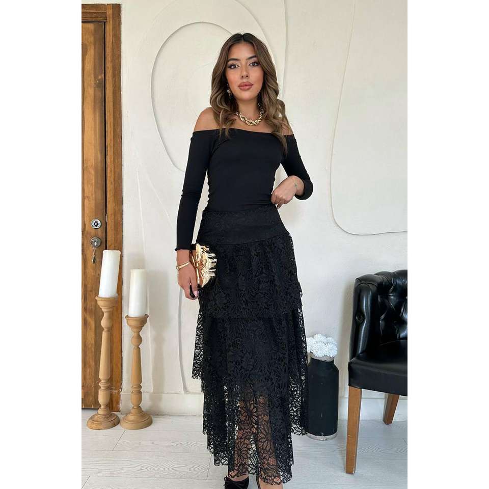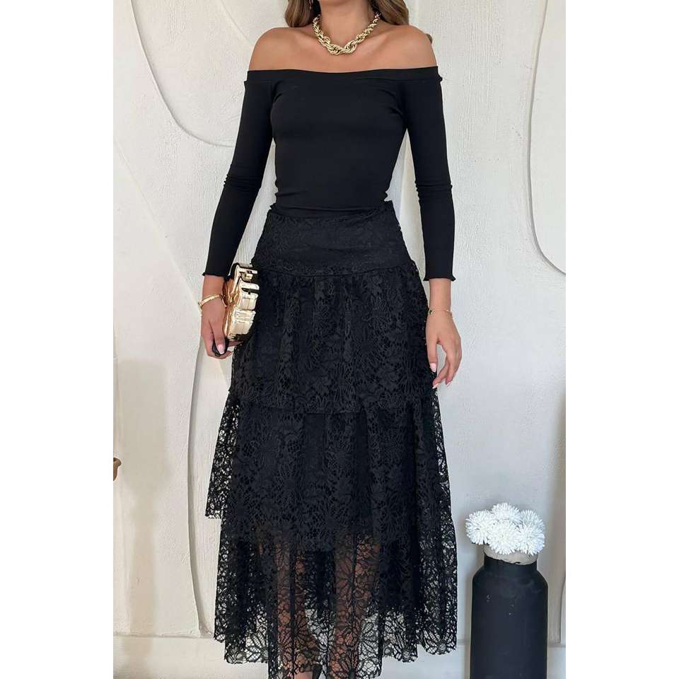 Black Lace Layered High Waist Skirt Women Elastic Fit Midi Length Fashion Skirt