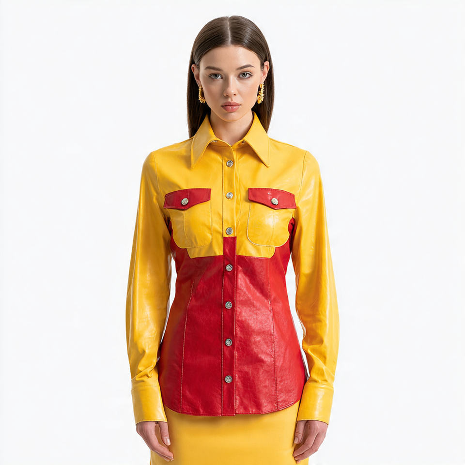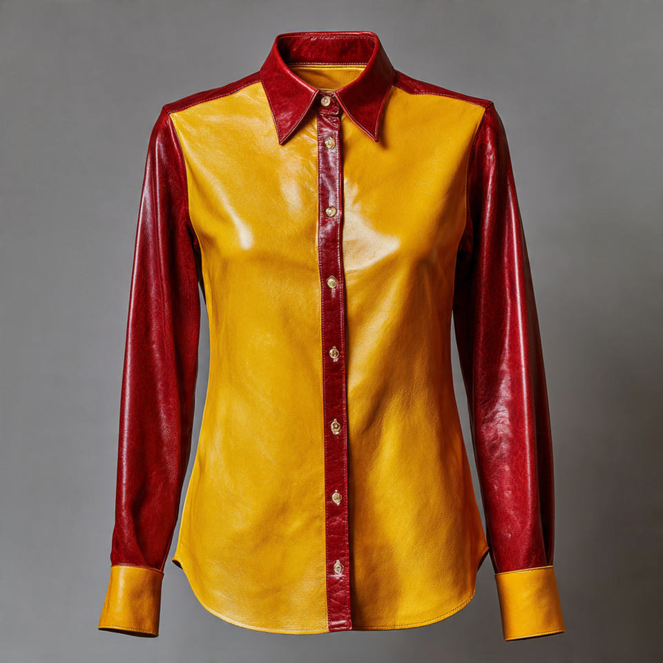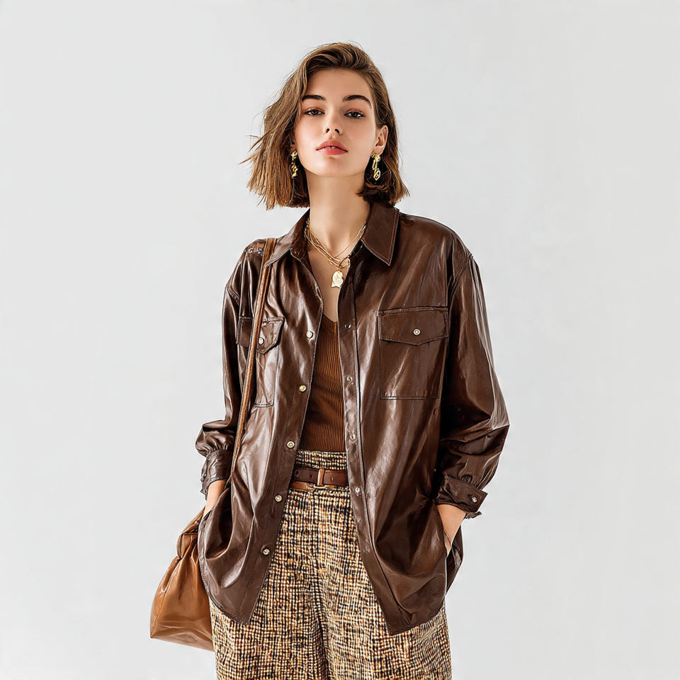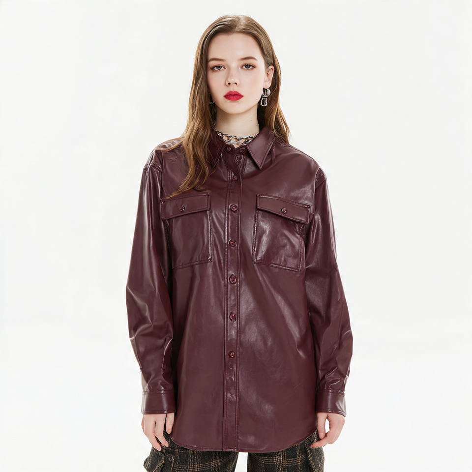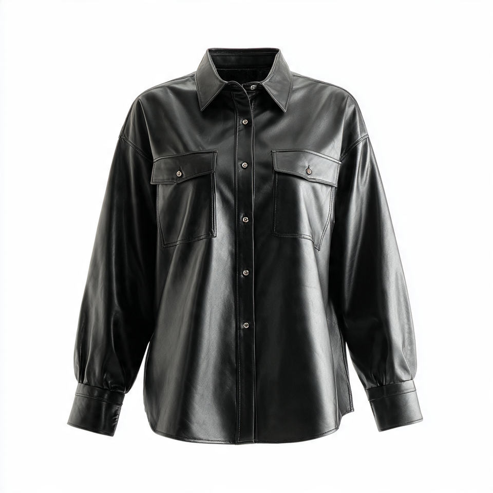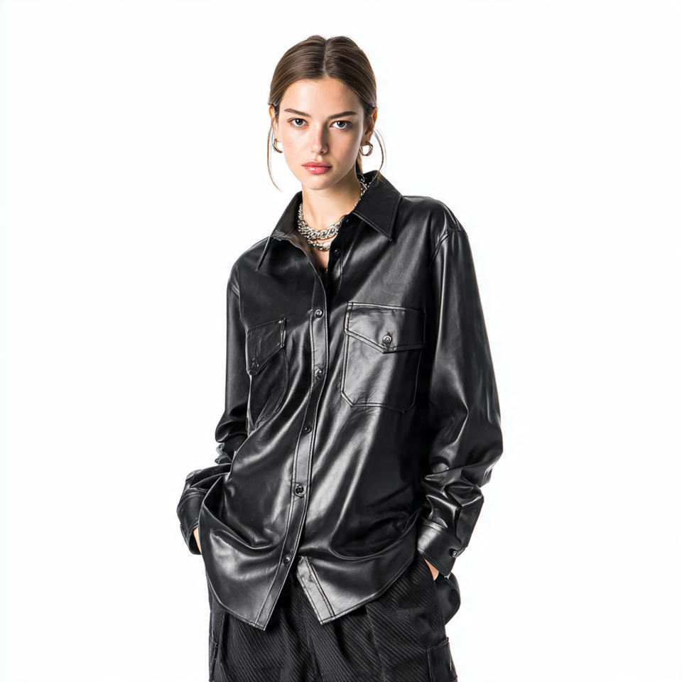 Black Leather Baggy Shirts Women's Outdoor Vintage Button Down Leather Shirt Ladies Letterman Fashion Leather Shirt Ladies