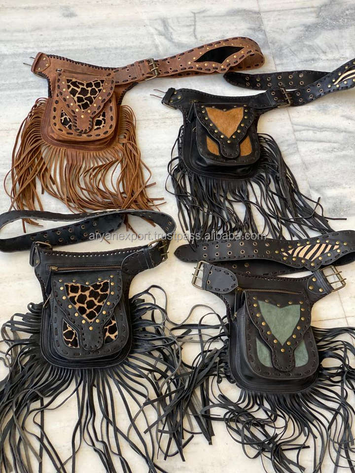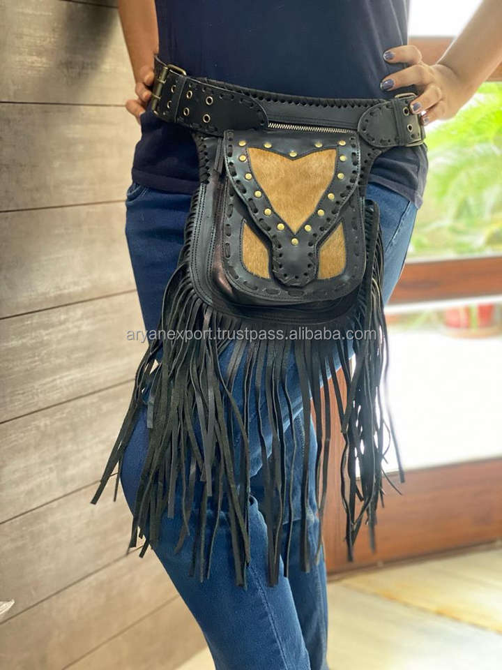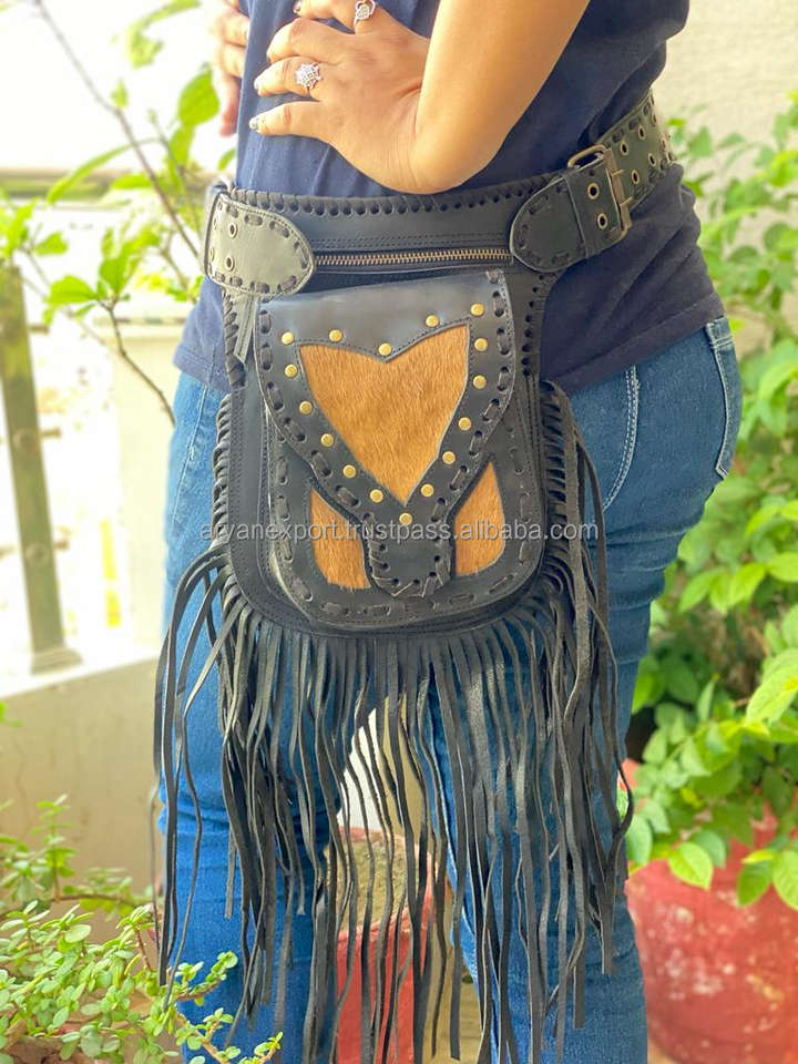 Black Leather Hip Pocket Belt Hand Stitched Waist Bags Hair on Belts Waist Bags Unisex