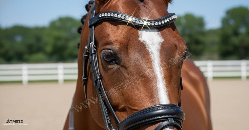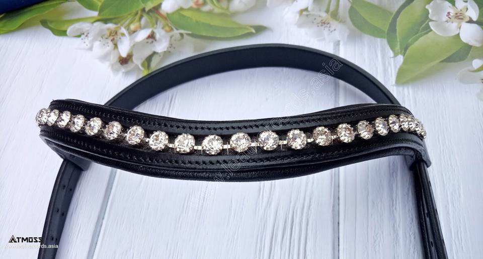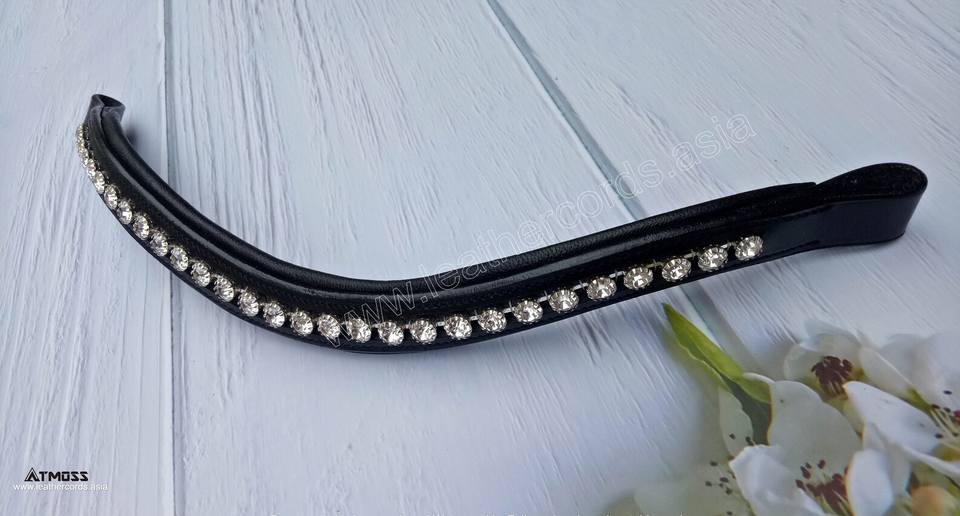 Black Leather Horse Browband with Single Row Large Clear Crystal Stones Premium Curve Bridle Browband