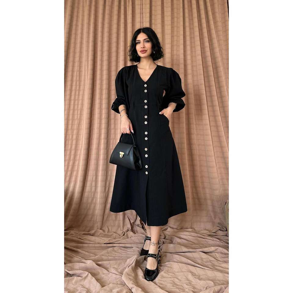 Black Linen Vintage Button Down Dress Women's Everyday Style Puff Sleeve Midi Length