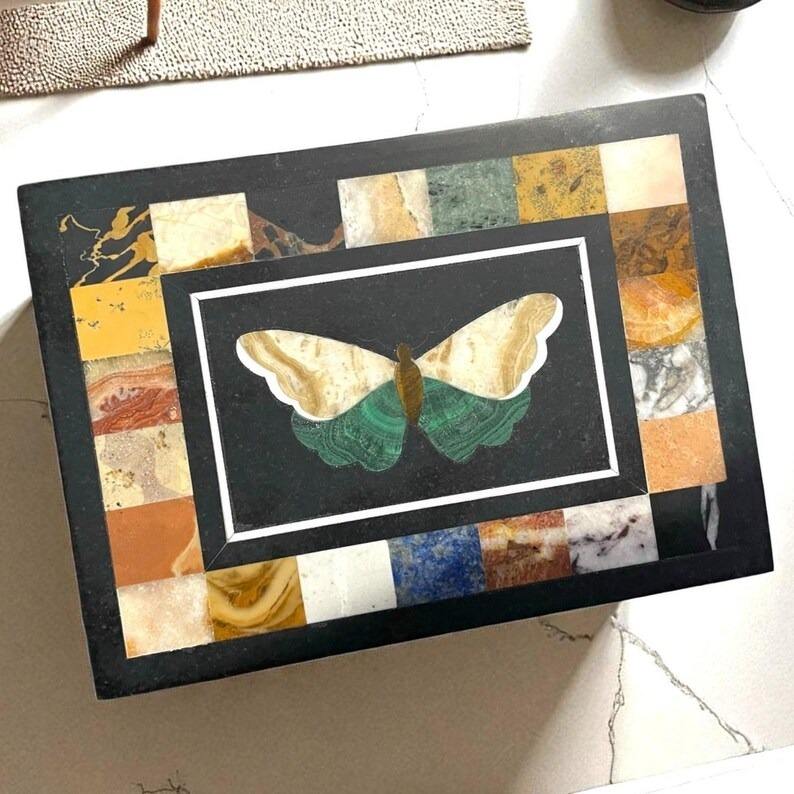 Black Marble Coffee Table with Floral Marquetry Handmade Gemstone Inlay Design Top for Living Room Decors