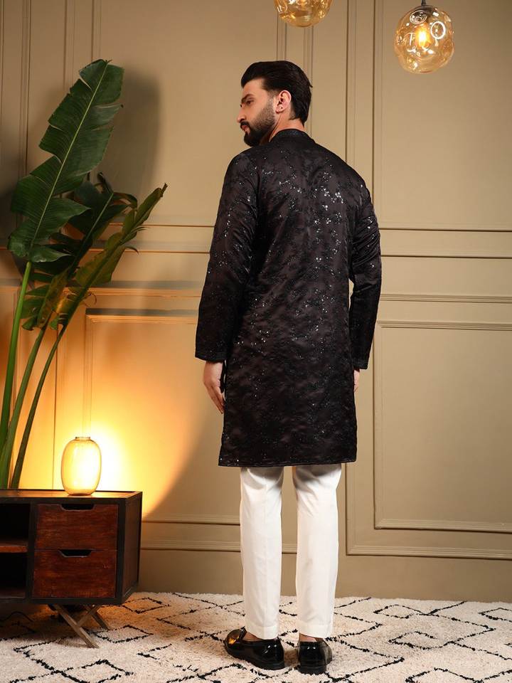 Black Men's Traditional Slim Fit Knee-Length Silk Kurta All-Over Sequin Work Embroidered Tunic Pajama Set Party Wear Indian