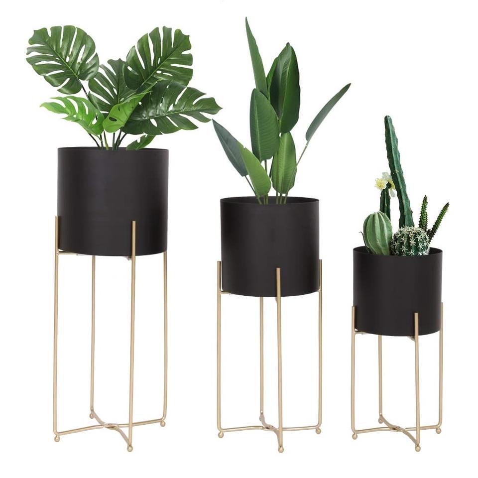 Black Metal Eco-Friendly Garden Planter Set with Gold Stand 3 Pcs Modern Floor Planters Foldable Stand for Indoor/Outdoor Use