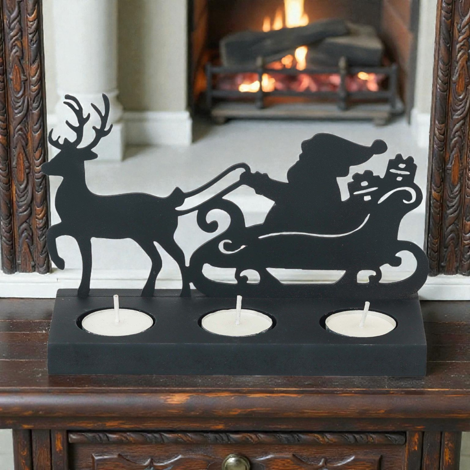 Black Metal Santa Sleigh Tea Light Holder with Reindeer Design 3 Candle Table Decor Christmas Decoration