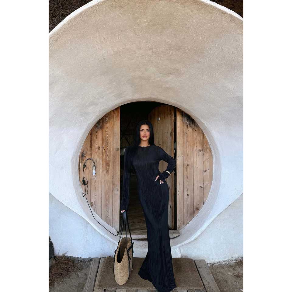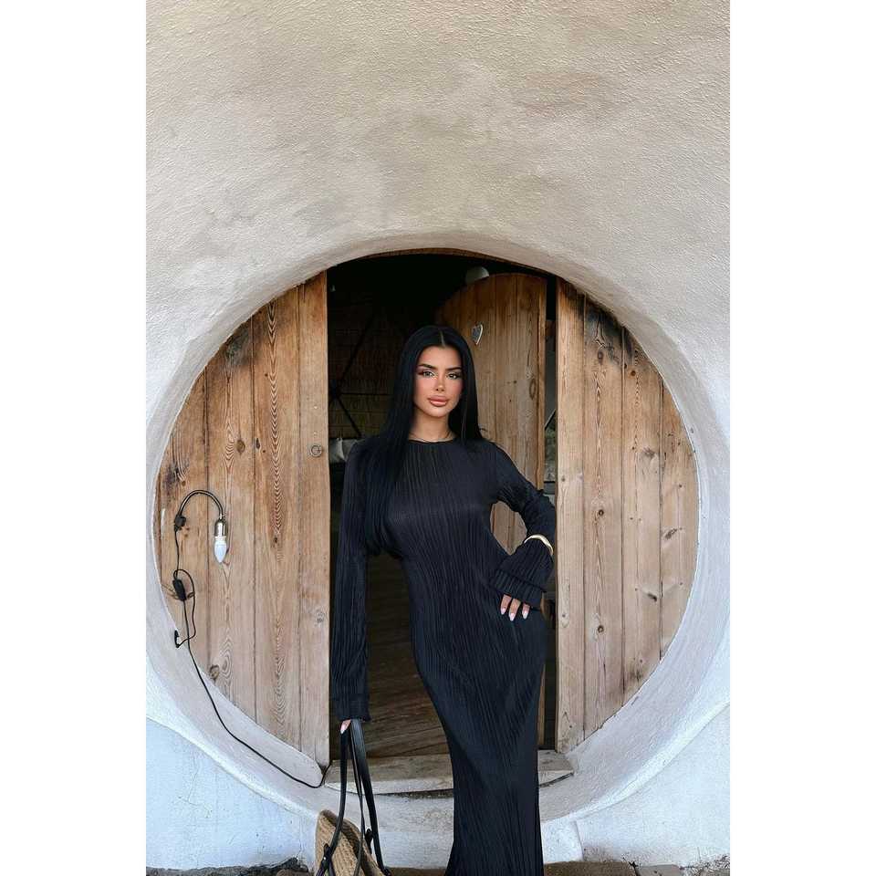 Black Mirela Pleated Long Career Dress
