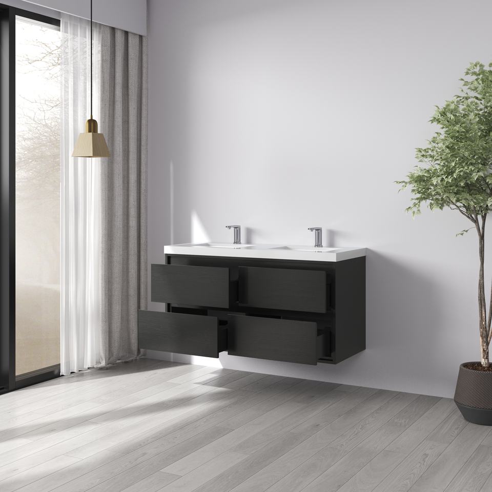 Black Modern Double Faucet Hole Wall Mounted Bathroom Vanity with Granite Sink and Drawer Storage Cabinet Made of Melamine