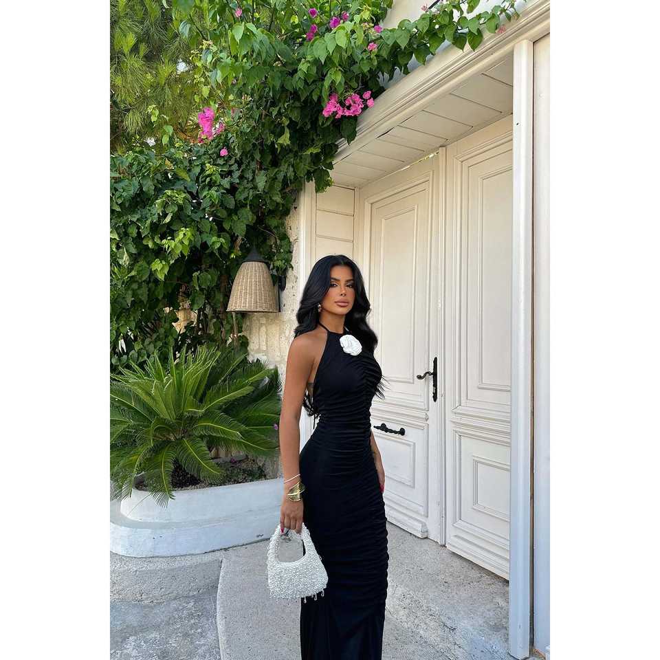 Black Modern Formal Party Ball Gown Dress Rose Detail Sequined Decoration Tie-Up Winter XL Size Woven Floor-Length A-Line Slit