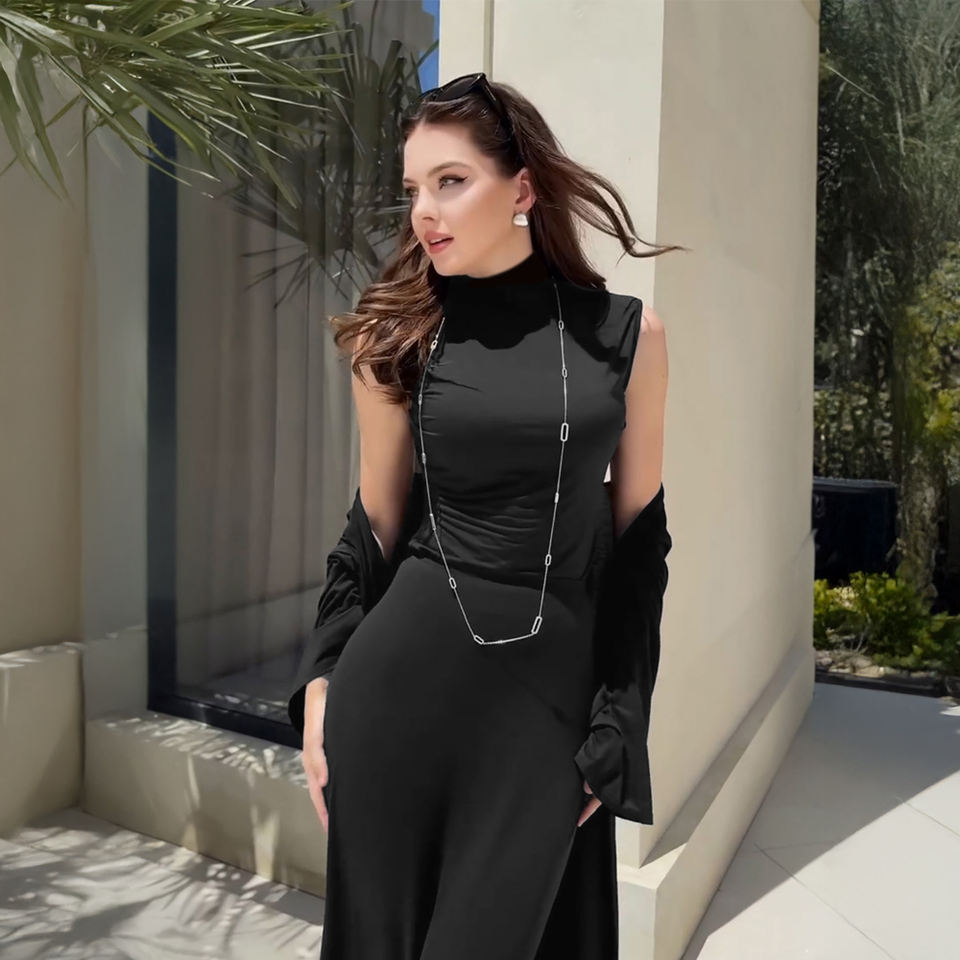 Set Includes:High Neck Sleeveless Top, Maxi Skirt, Longline Kimono