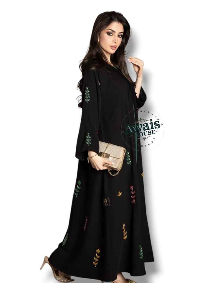 Black Nidha A-Line Floor-Length Modest Islamic Solid Eco-Friendly Abaya Long Sleeves V-Neck Crystal Beaded Simple Design for
