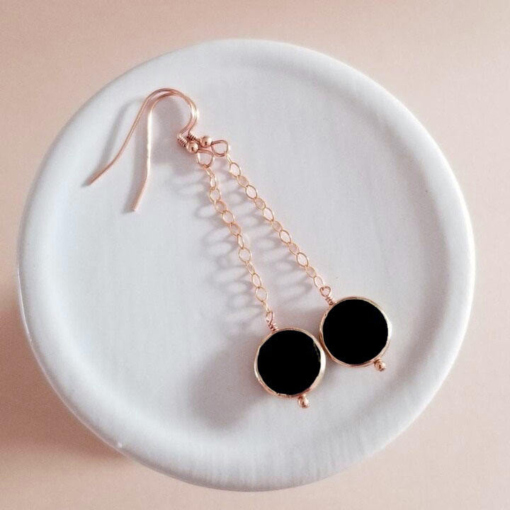 Black Onyx Coin Shape Dangle Earrings Deep Black Natural Gemstone Rose Gold Plated Handmade Jewelry for Women