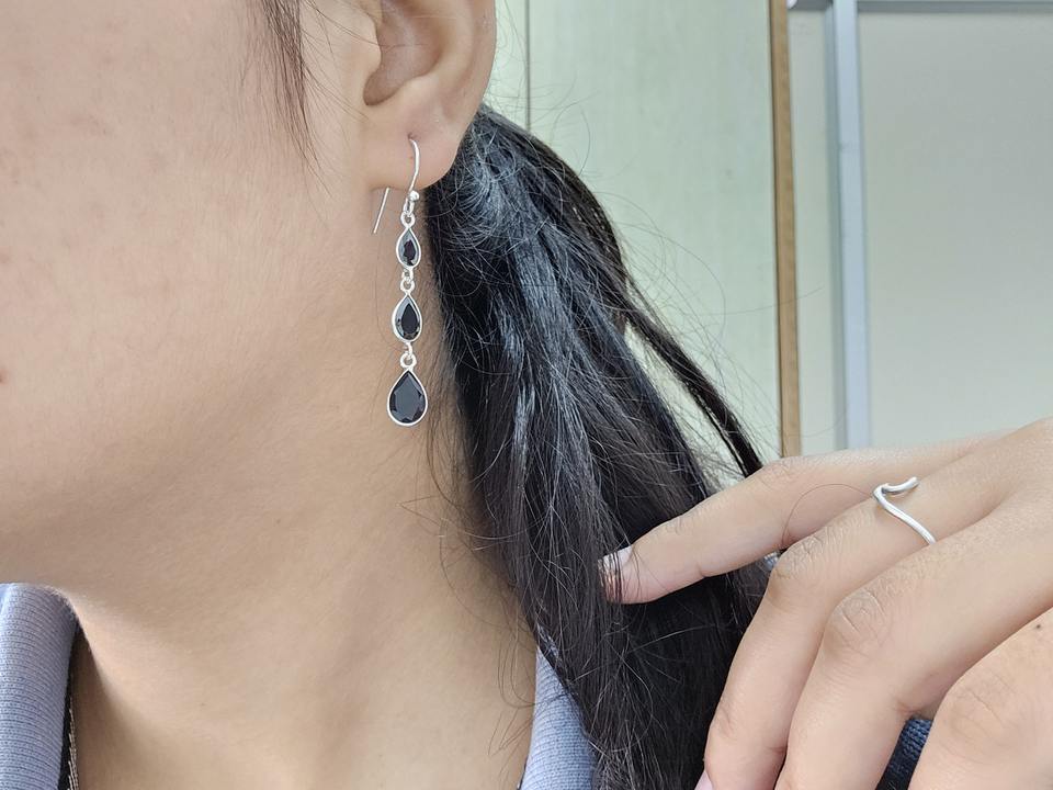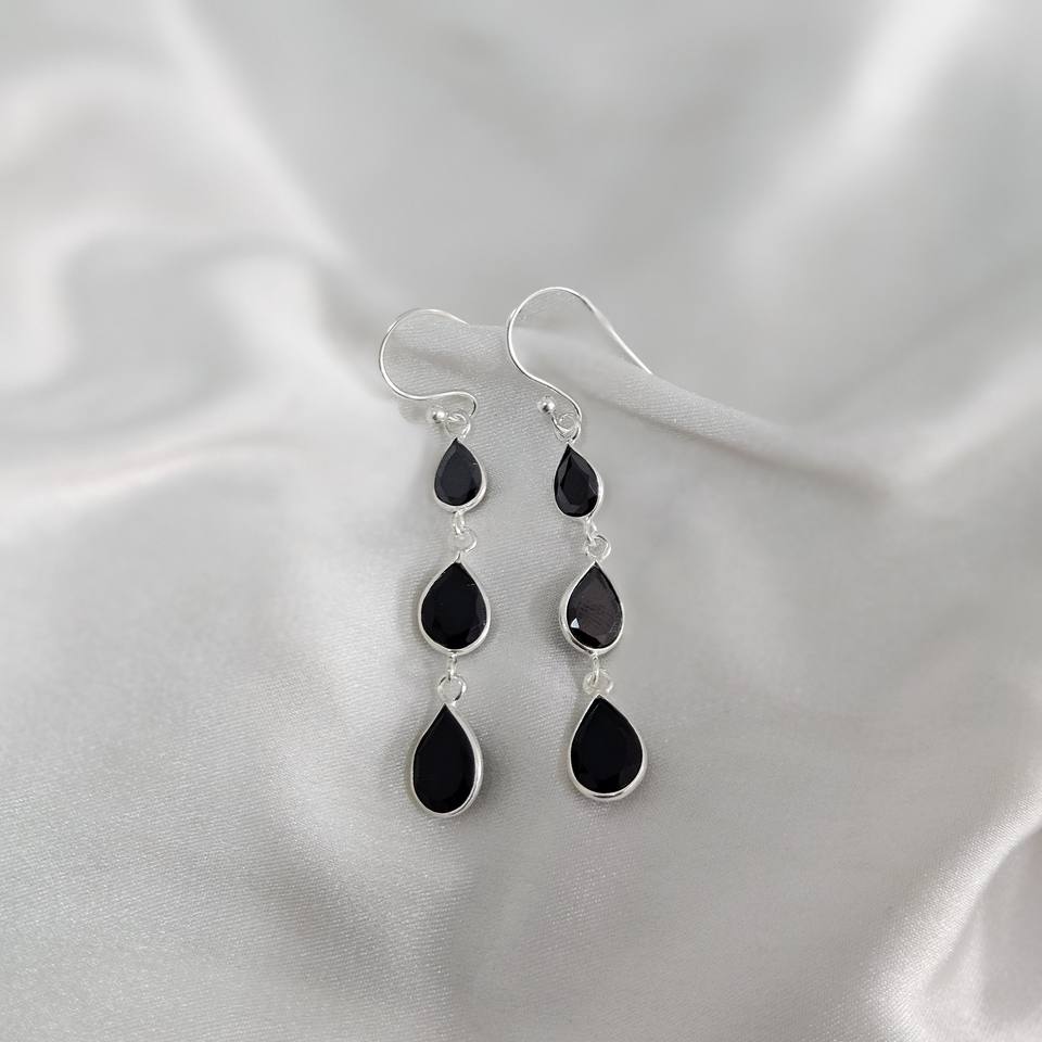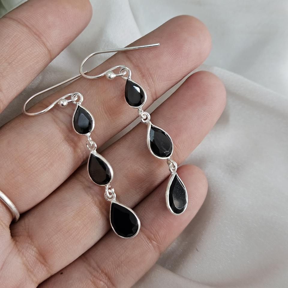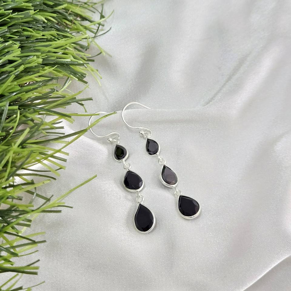 Black Onyx Drop Triple Gemstone Bezal Sterling Silver Bohemian Earrings for Wedding Party & Gift Occasions