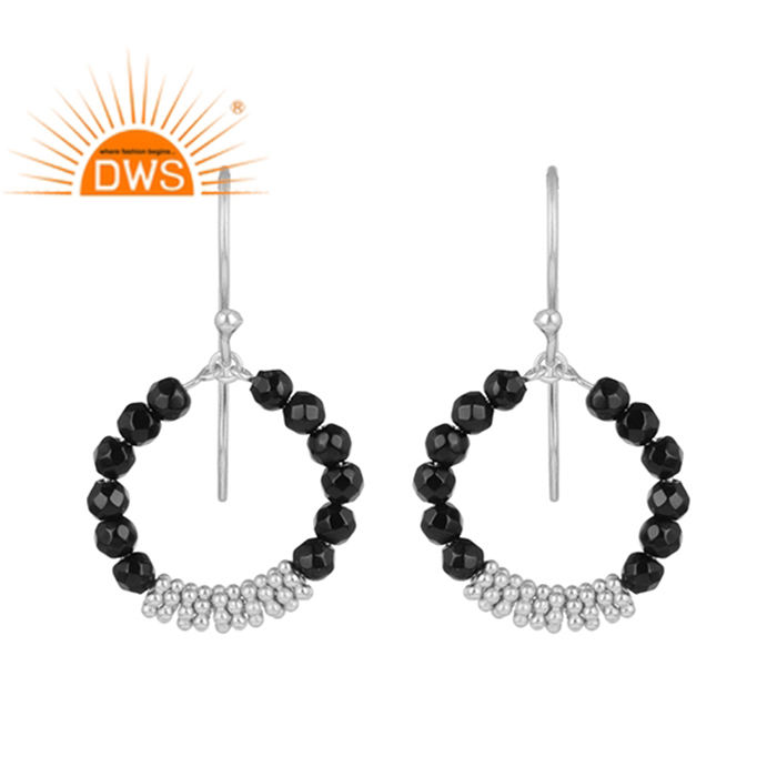 Black Onyx Gemstone Beads Set Fine 925 Sterling Silver Round Dangle Earring Jewelry For Women Gift For Her Vintage Collection