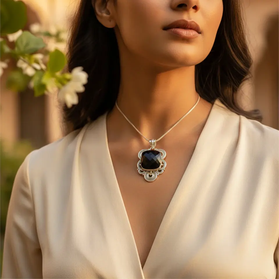 "Black Onyx Geometric Pendant Necklace for Women in 925 Silver"