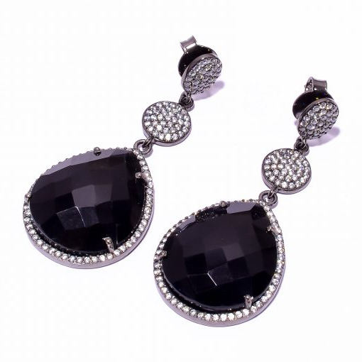 Black Onyx Zircon Gemstone Pave Gold Plated 925 Sterling Silver Stud Earrings 2.1 Inch Anniversary Party Gift
