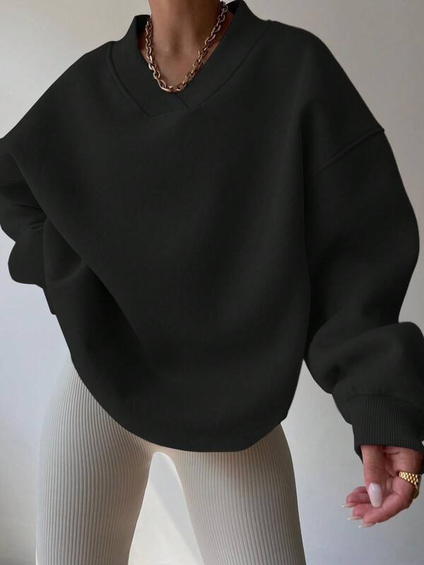 Black Oversized Women's V Neck Sweatshirt Heavyweight Cotton Fleece Pullover Drop Shoulder Loose Fit Long Sleeve Streetwear