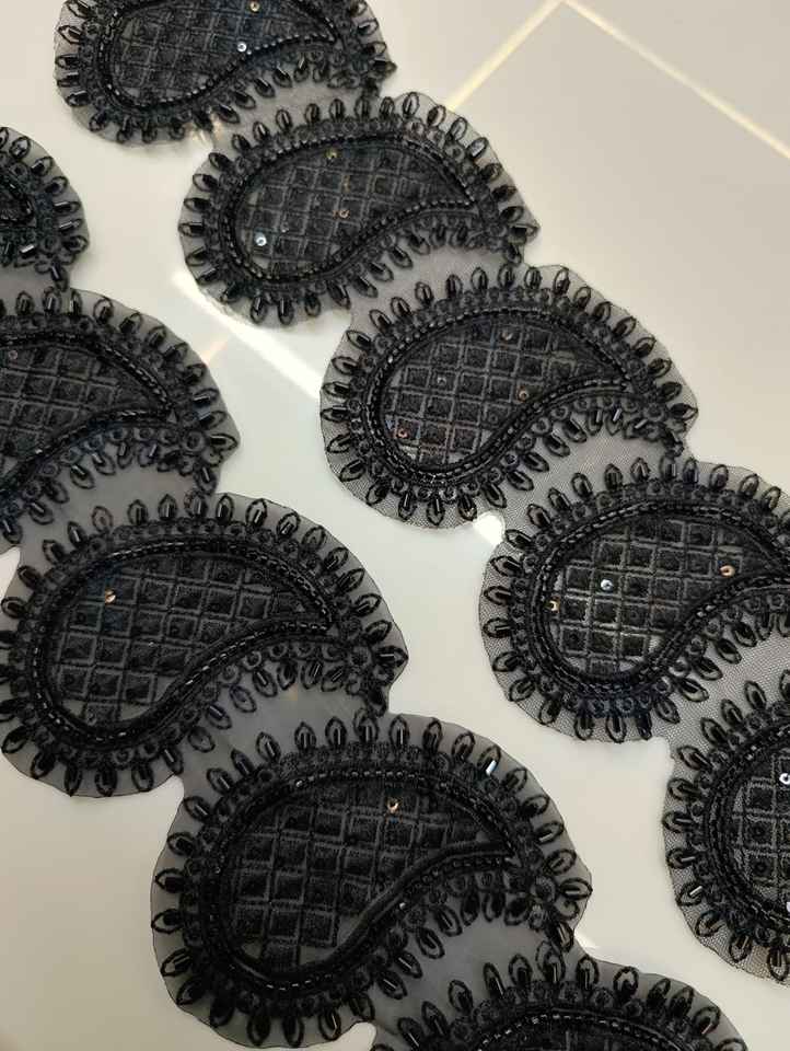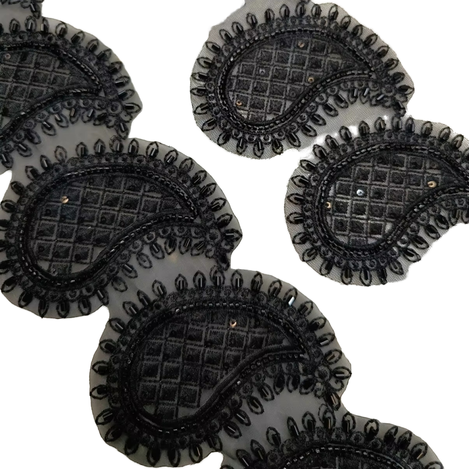 Black Paisley Lace Motif with Beads Embroidery Garment Trim Floral Embroidered Beaded Lace Applique for Clothes and Bags