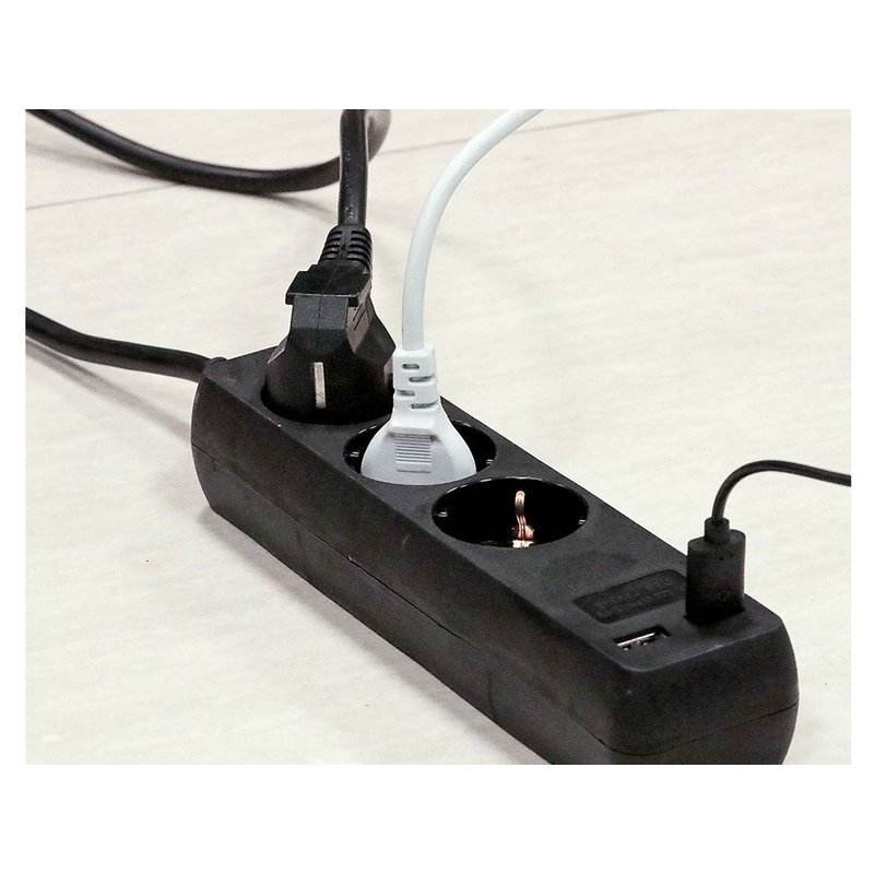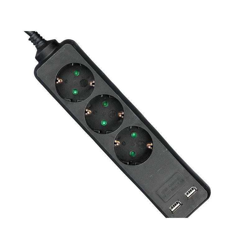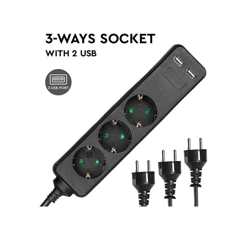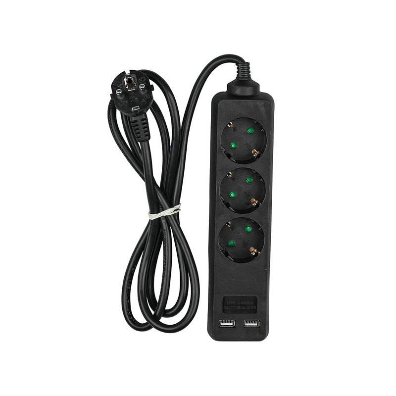 Black Power Strip 2 USB Ports 3 Schuko Sockets 10A 1.5m Long Cable 3x1.5mmq SKU-8776 15A Rated Extension Cord for Wi-Fi Network