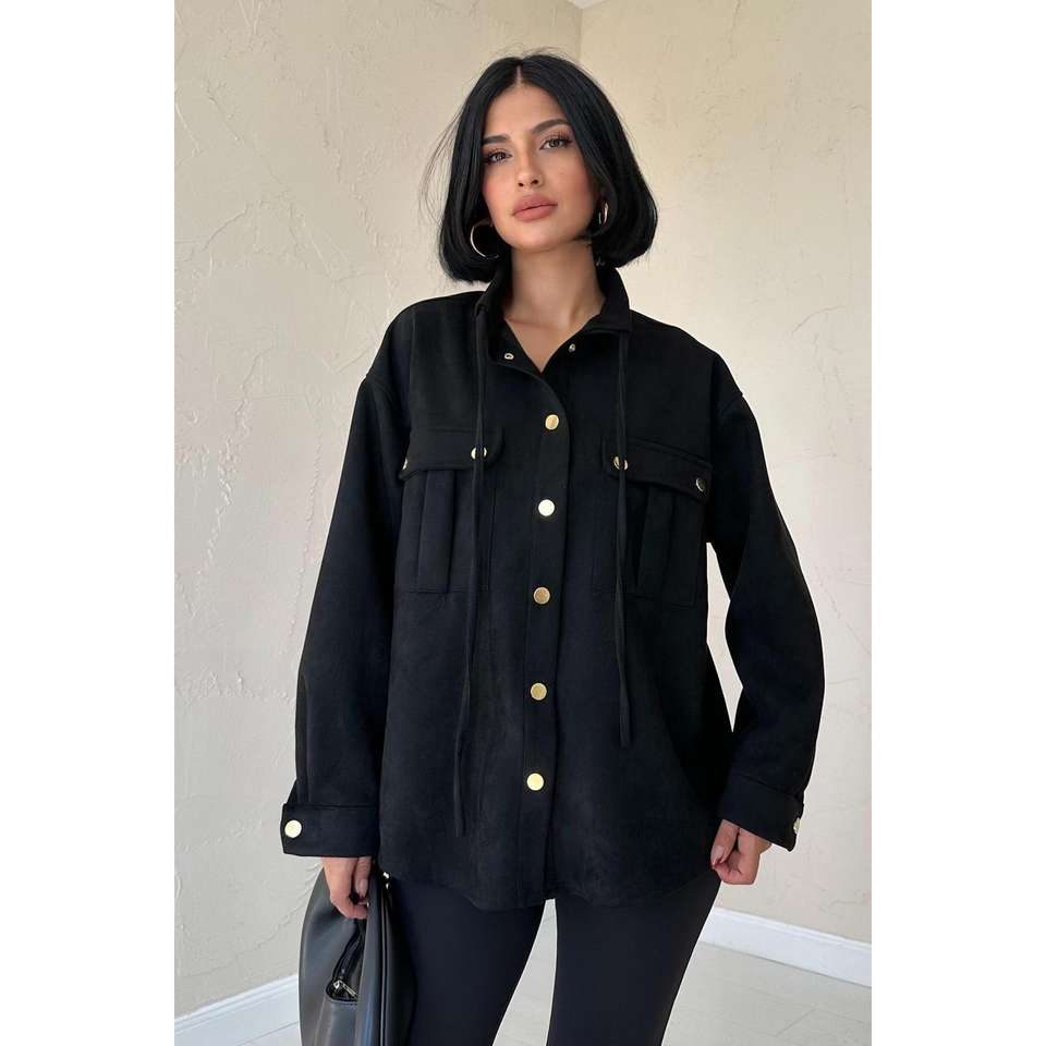 Black Snap Button Suede Shirt Women Minimalist Everyday Style Simple Design Button Down Blouse