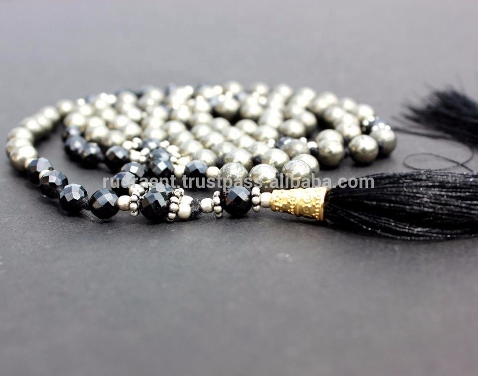 Black Spinel Gemstone Mala Beads Necklace with Silk Tassel Long Natural Stone Knotted Chain Religious and Spiritual for Gift