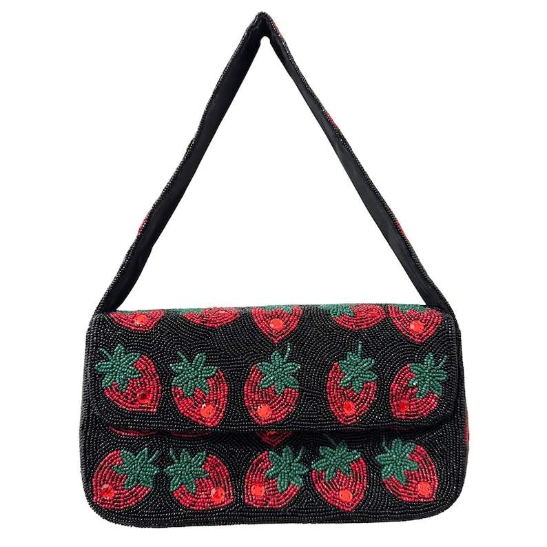 Black Strawberry Beaded Shoulder BagHandmade Sequin Fruit Purse Red Statement Bag