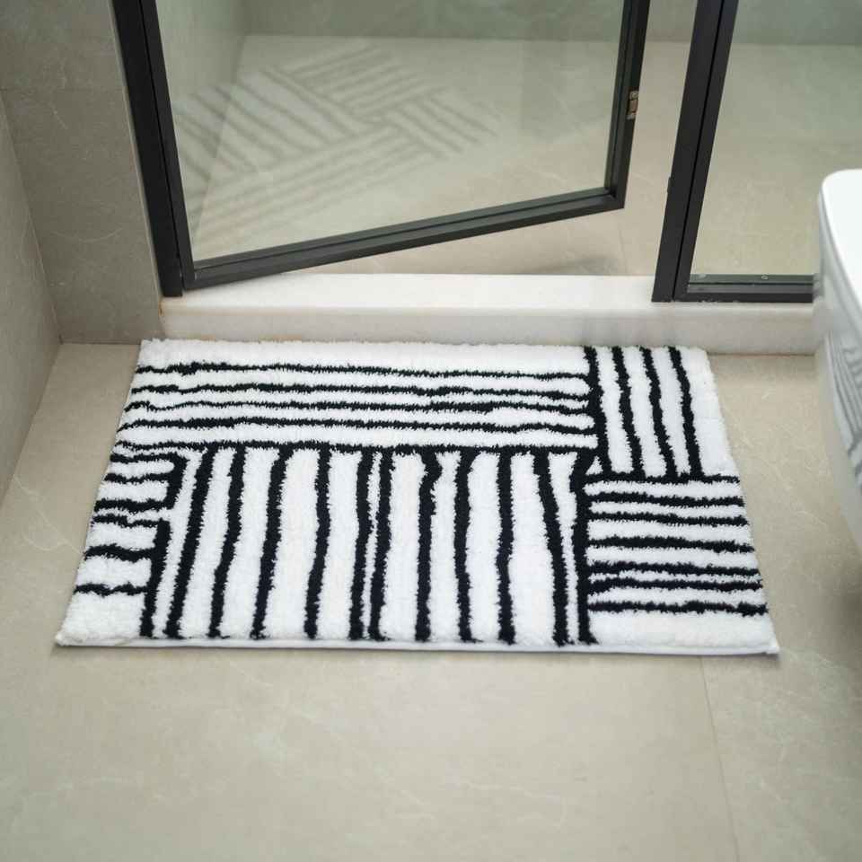 Black Stripe Anti-Slip Cotton Bath Mat Absorbent Blue White Floor Rugs Machine Washable Bathroom Rug By INDIAN TEXTILES H/L