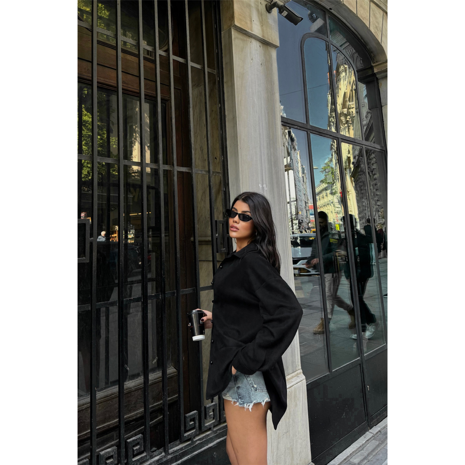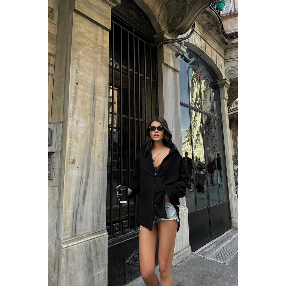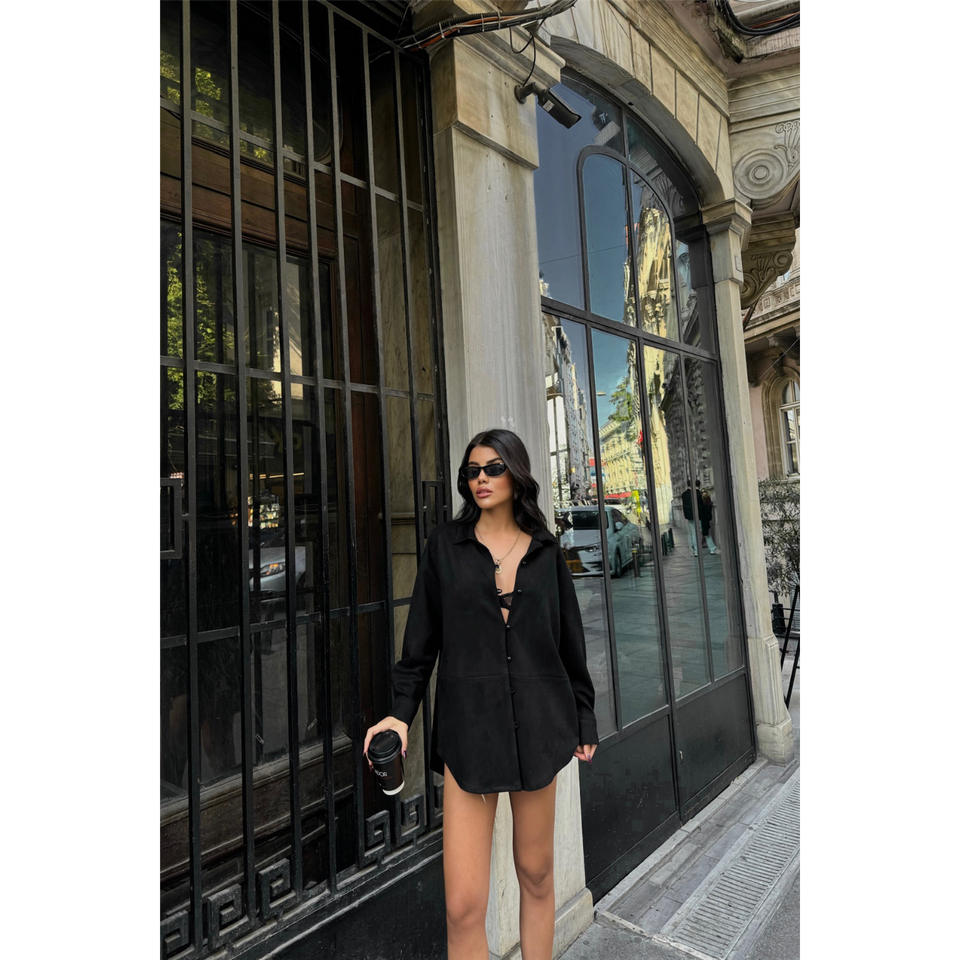 Black Suede Boyfriend Shirt Women Button Down Halter Lace Up Everyday Style Blouse