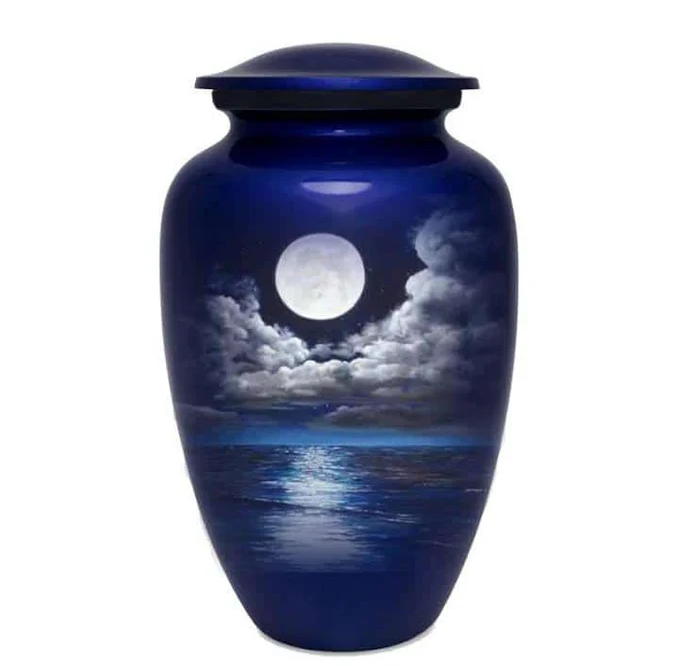 Black Sunset Beach Scene Metal Cremation Urn with Golden Horizon Artwork for Peaceful Cremation Memorial