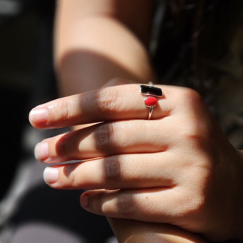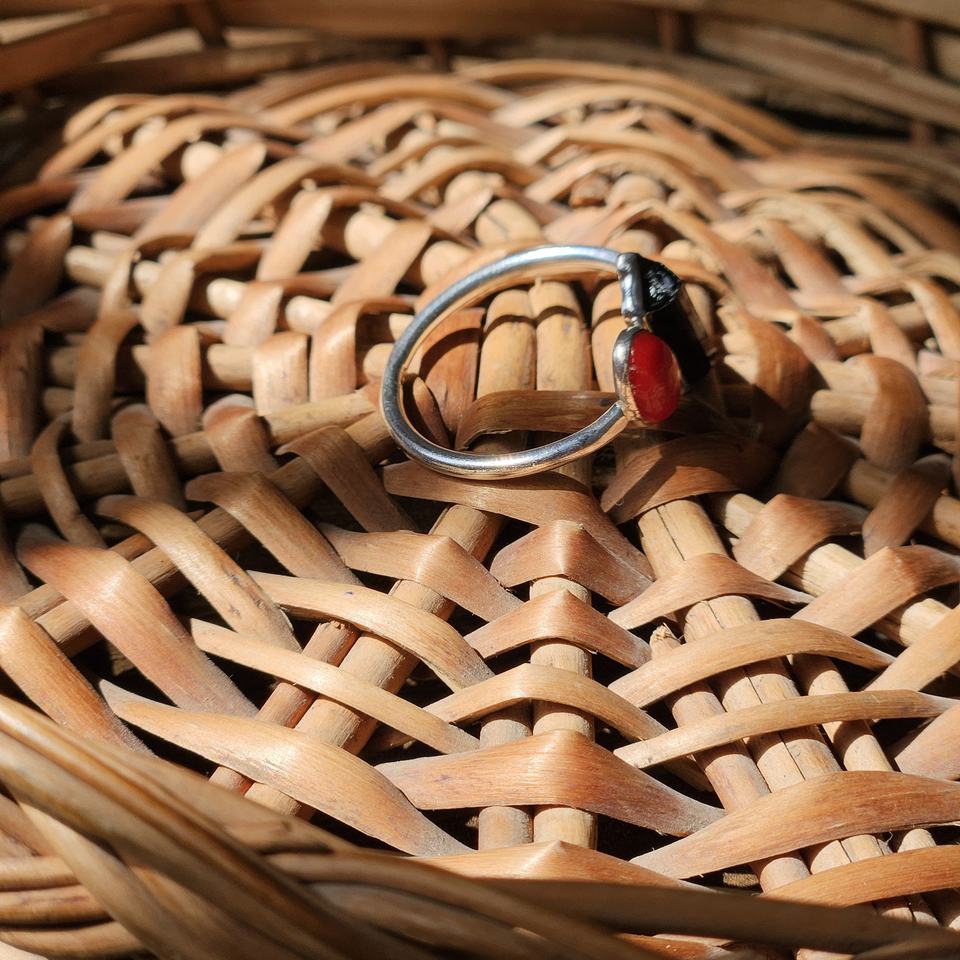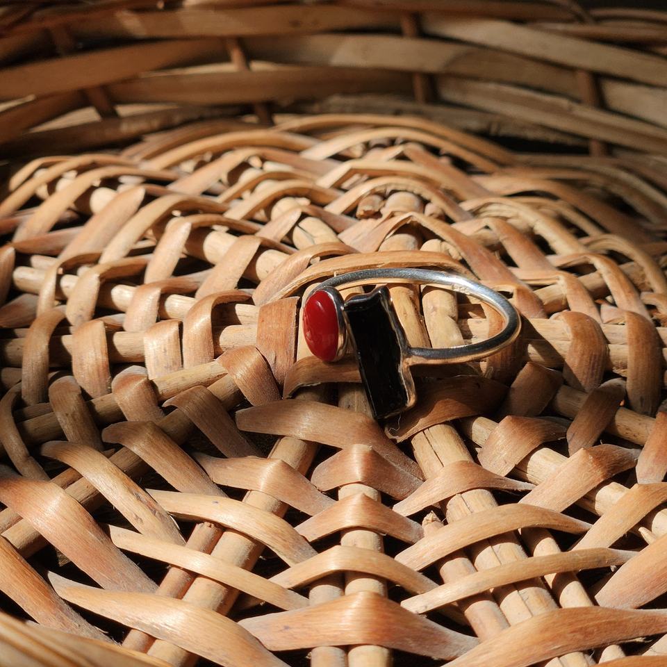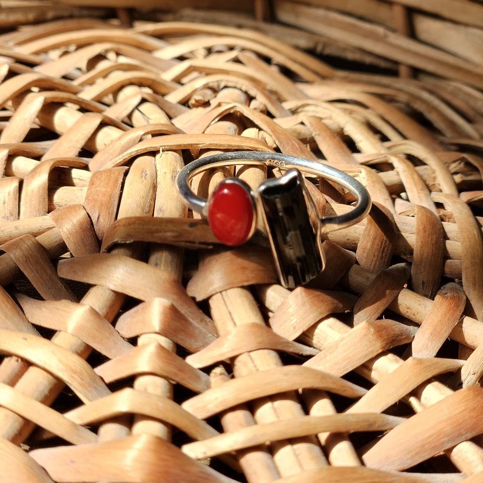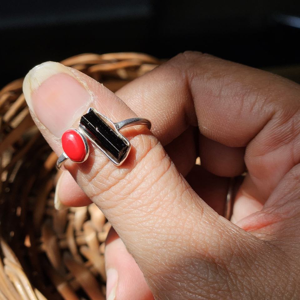 Black Tourmaline & Coral Gemstone Adjustable Silver Ring Black and Red Gemstone Silver Ring
