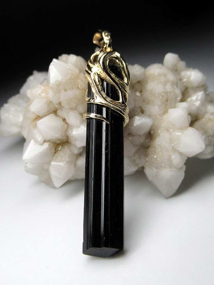 Black Tourmaline Pendant Raw Uncut Schorl 925 Silver 14K Gold Plated Art Nouveau Necklace Unisex Dark Magic Healing Crystal