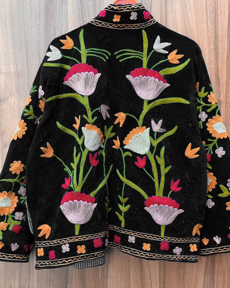 Black Velvet Floral Suzani Coat with Hand Embroidered Boho Style Uzbek Folk Festival Duster Outerwear Warm Cotton Filled Jacket