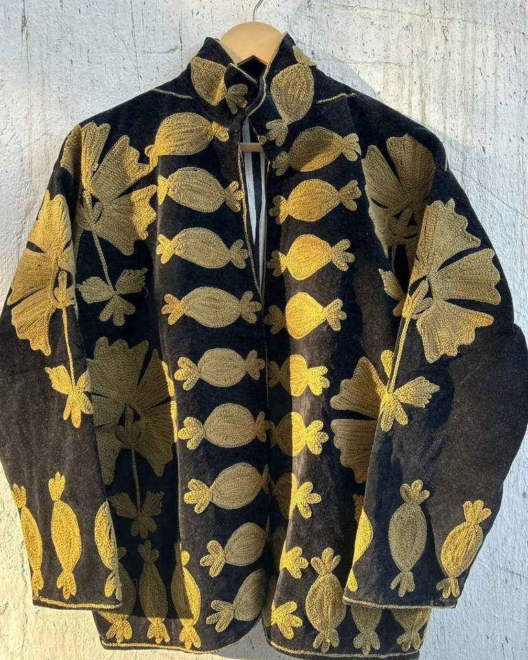 Black Velvet Suzani Gold Embroidered Boho Coat Winter Duster Jacket Floral Pattern Cotton Filled Windproof Knitted Processed
