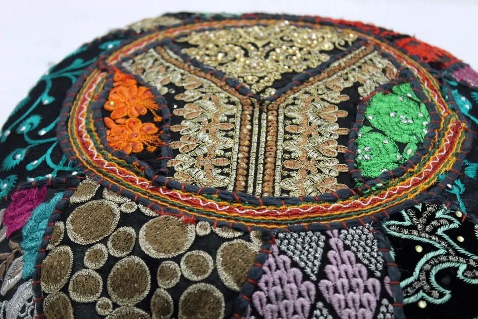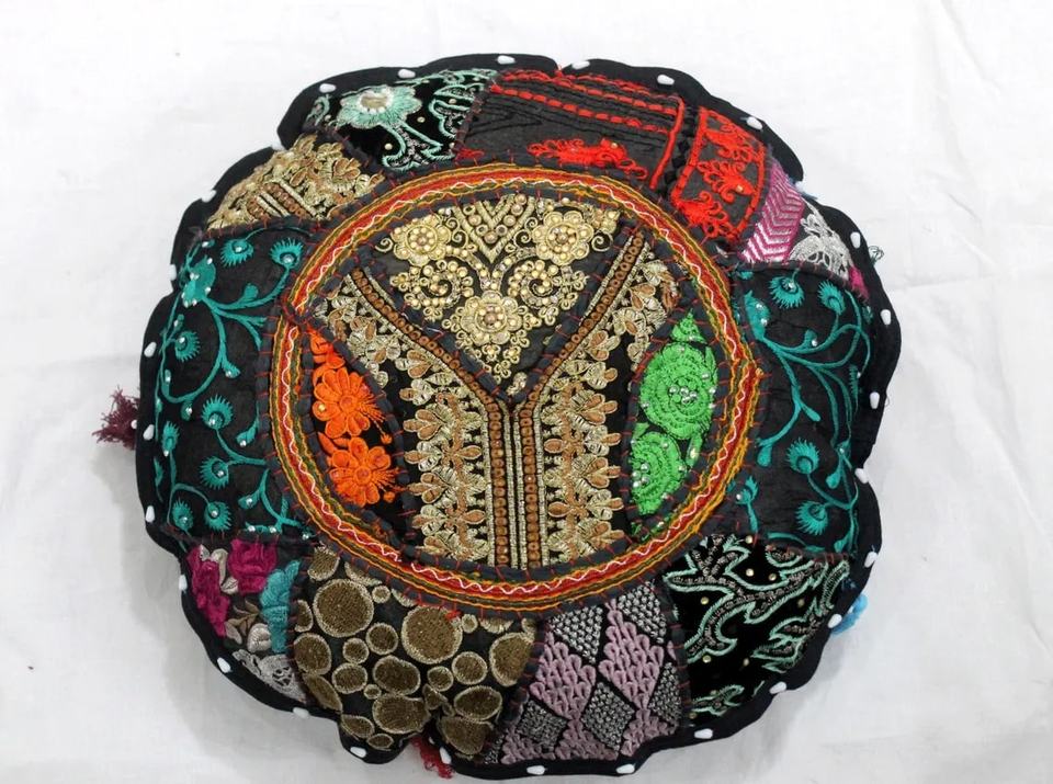 Black Vintage Floral Embroidered Round Cushion Cover Throw Bohemian Floor Patchwork Pillow Cover