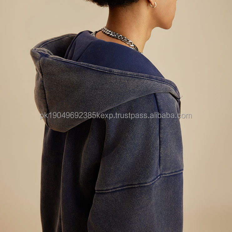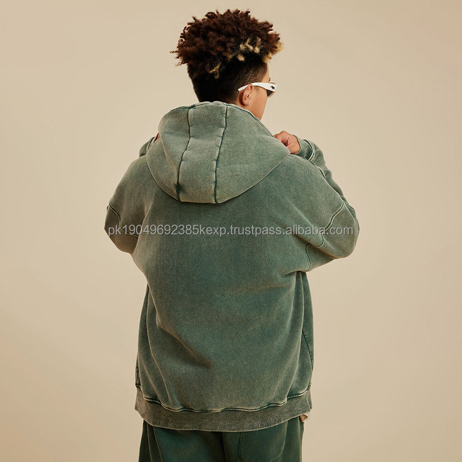 Black Washed Vintage Distressed Acid Wash Hooded Zipper Hoodie Unisex Custom DIY Pattern Lined Fleece by Manufacturer