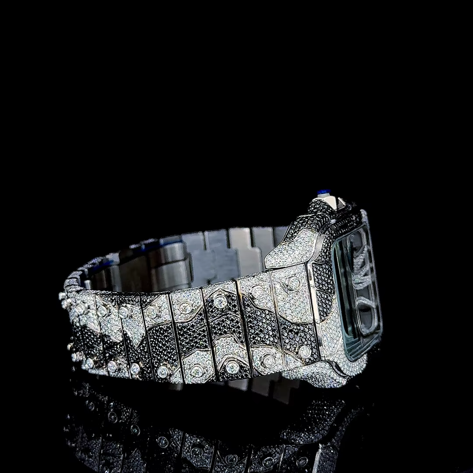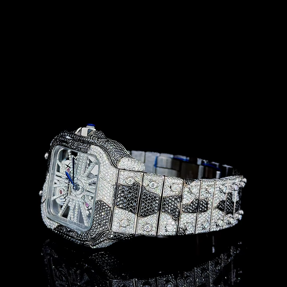 Black White Camouflage Stainless Steel Strap Fully Iced Out Moissanite Watch for Men, Square Shape Skeleton Dial Watch For Him