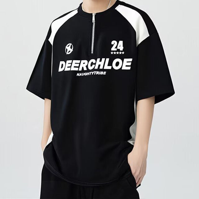 Black White Color Block Jersey Style T-Shirt Men's Outfit Half Zip Motorcycle Short Sleeve Summer Trendy Couple Sweatshirt