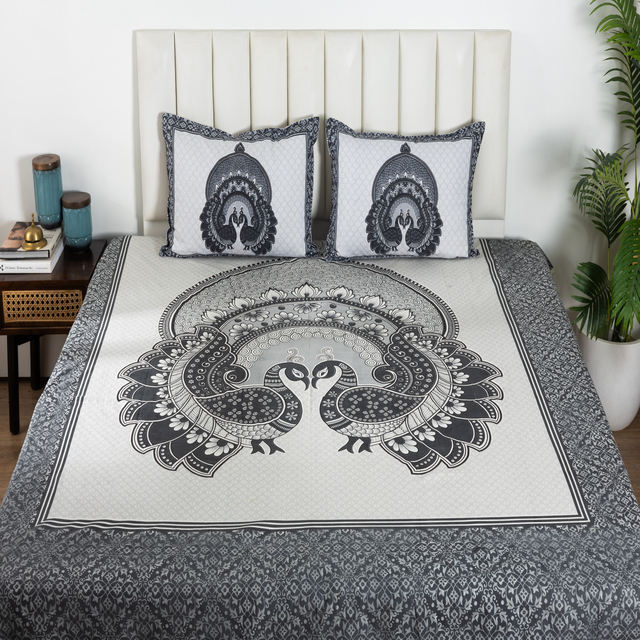 Black & White Peacock Printed Flat Cotton Bedsheet Set Double Bed Bedding 2 Pillow Covers Hotel & Home Style Wholesale Price