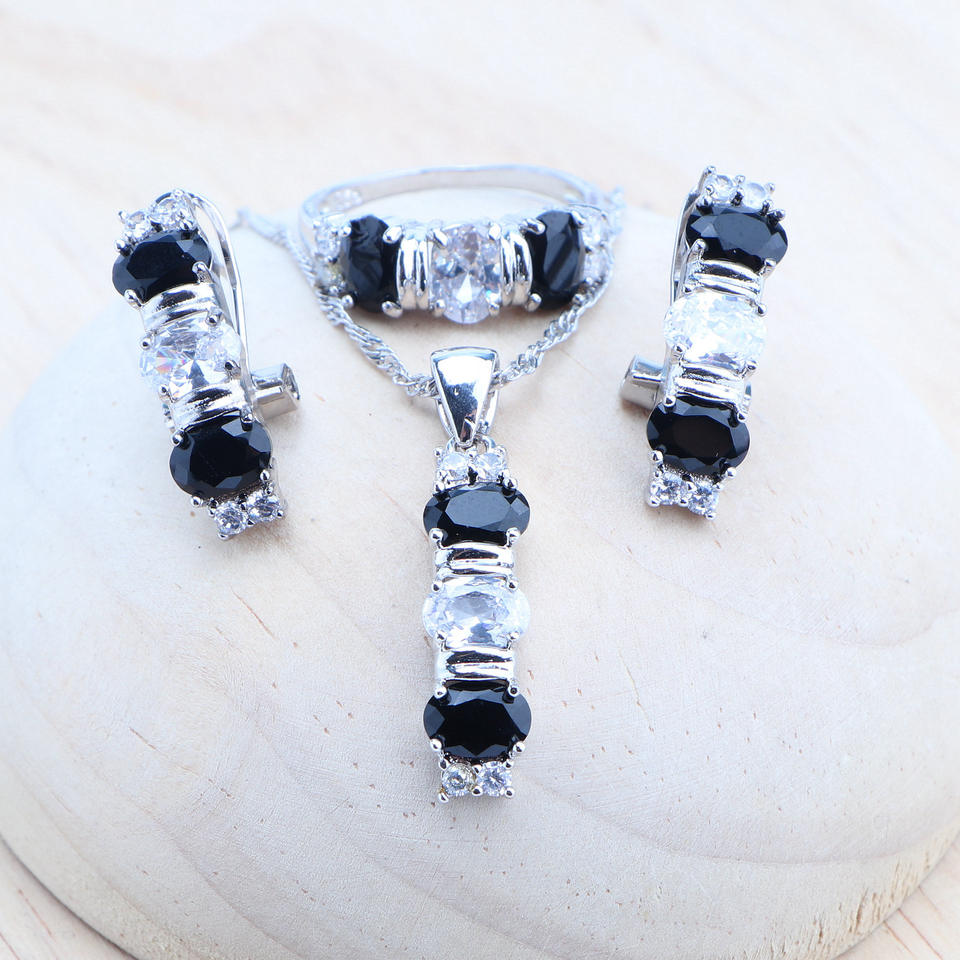 Black&White Topaz 925 Silver Bridal Jewelry Sets for Women Wedding Earrings Ring CZ Stones Bracelet Pendant Necklace Set