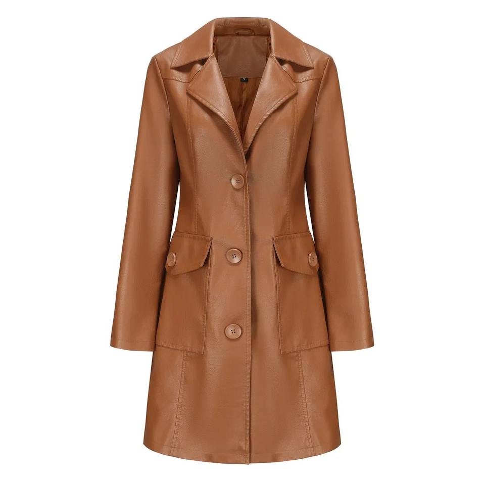 Black Women Long Leather Jacket, Spring and Autumn Long-sleeved PU Windbreaker Jacket Fashion Female Leather Trench Coat