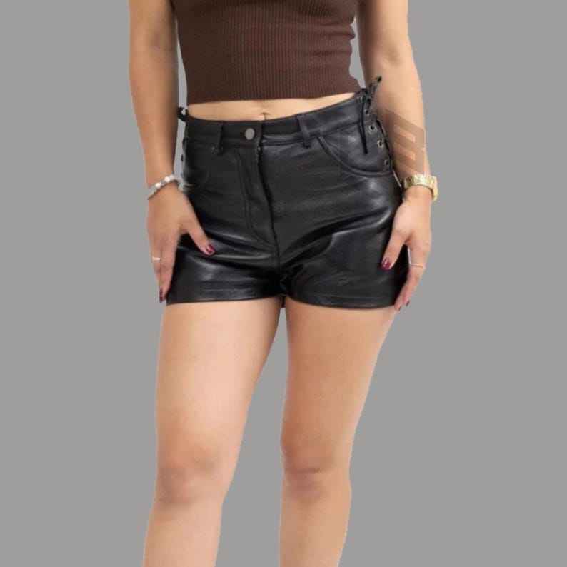 Black Women's Lamb Leather Shorts Edgy Streetwear Drawstring Closure Dot Pattern Breathable Light Wash Casual Crystal Decorated