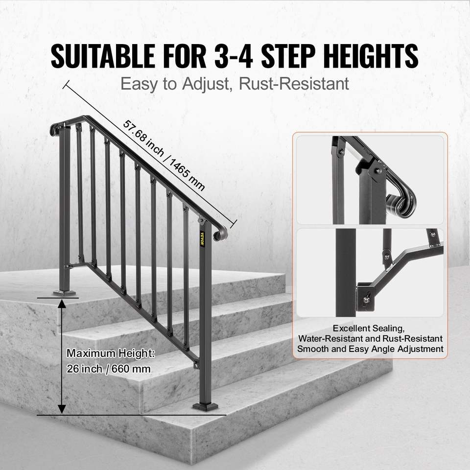 Black Wrought Iron Handrails Outdoor Steps Flexible Porch Railing Concrete/Wooden Stairs Transitional Style 4 Steps Model