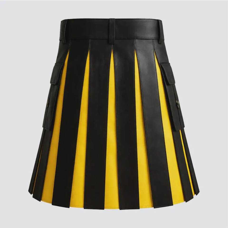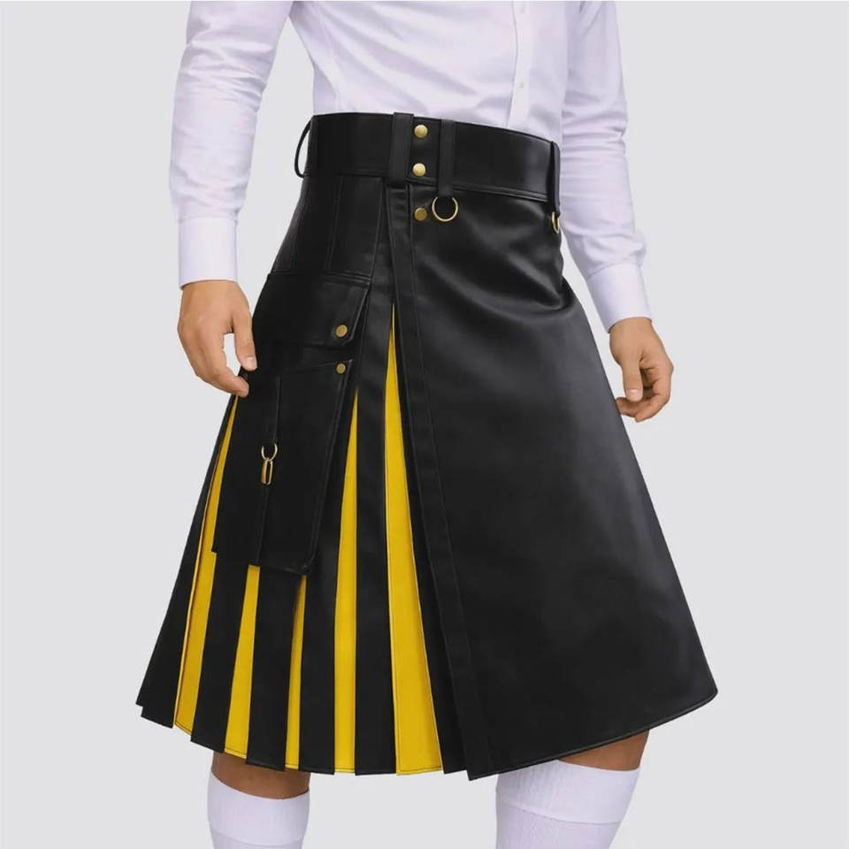 Black & Yellow Cow Leather Hybrid Kilt for Men Box Pleated Utility Kilt with Cargo Pockets