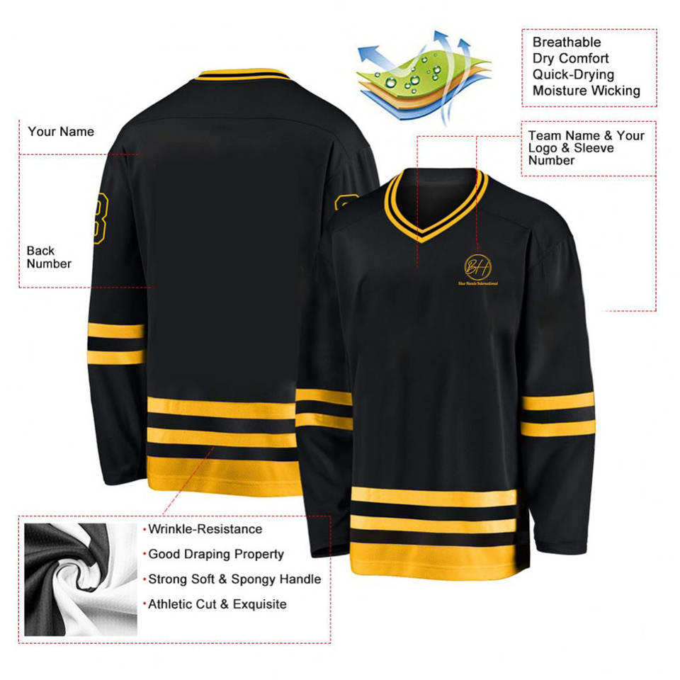 Black Yellow Hockey Jersey Custom Sublimated Team Uniform V Neck Long Sleeve Player Name Number Striped Athletic Gear