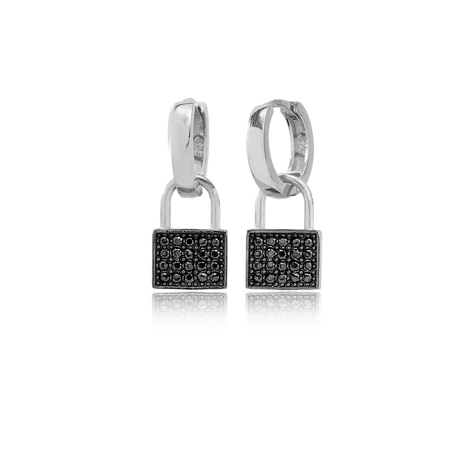 Black Zircon Padlock Design 12mm Hoop Dangle Earrings Wholesale Turkish 925 Sterling Silver Handcrafted Fine Jewelry for Women