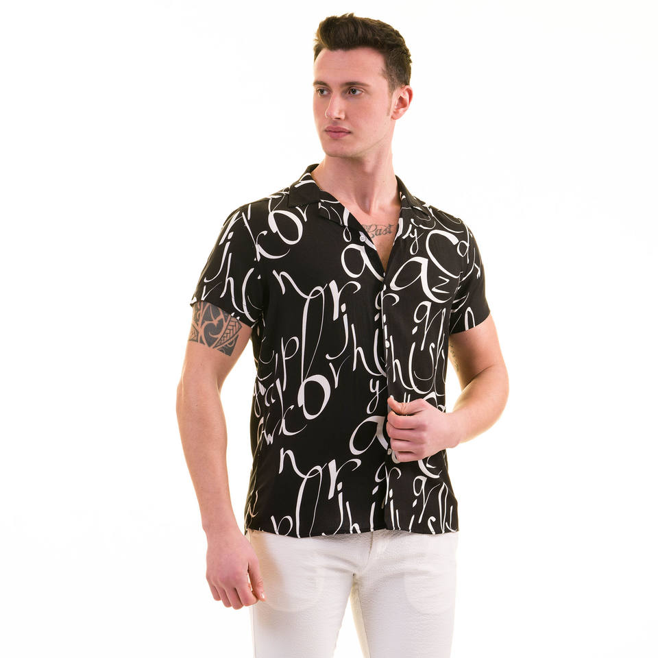 Black and White Alphabet Printed 100% Natural Viscose Wrinkle Free Breathable Men's Vacation Camp Collar Shirt