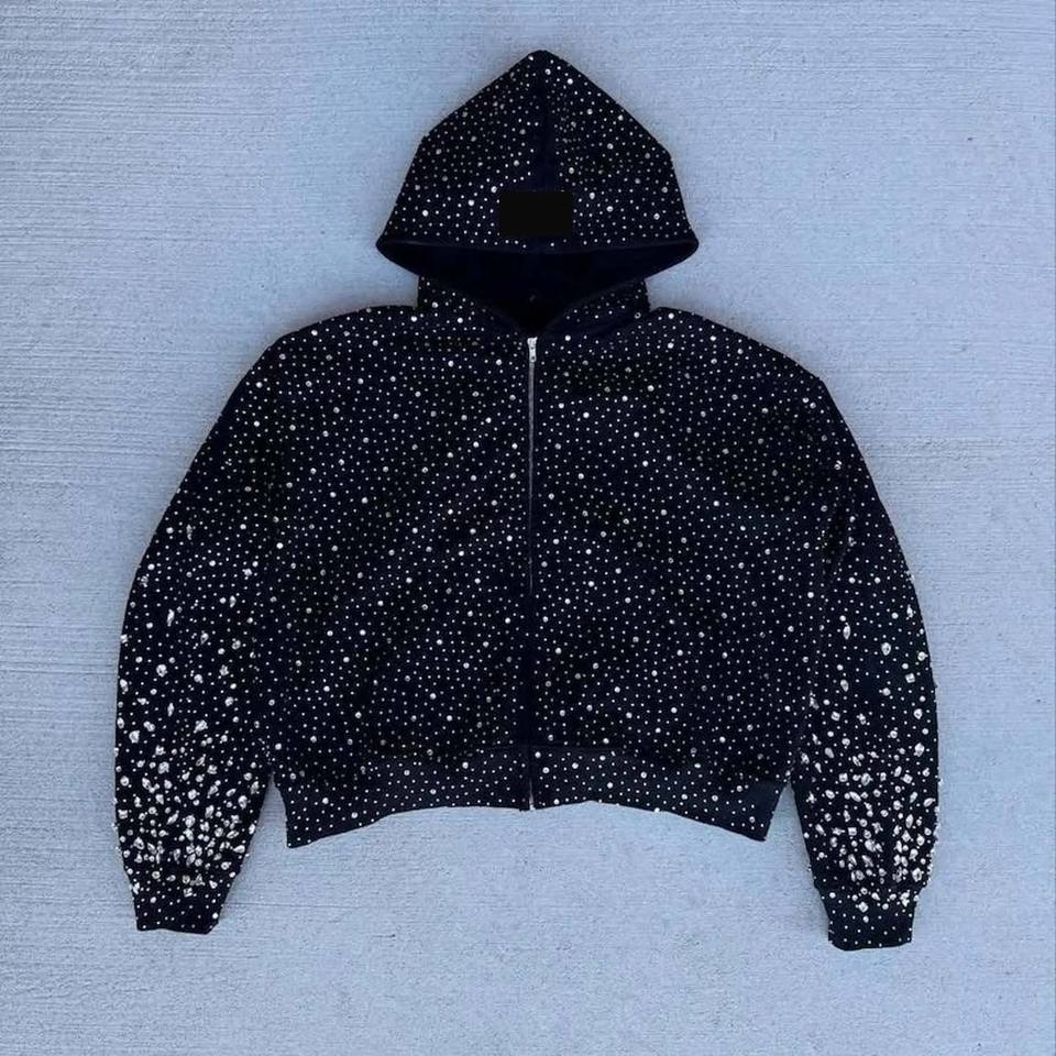 Black and White Rhinestone Zip Up Hoodie, Heavyweight Crystal Streetwear Black Hoodies