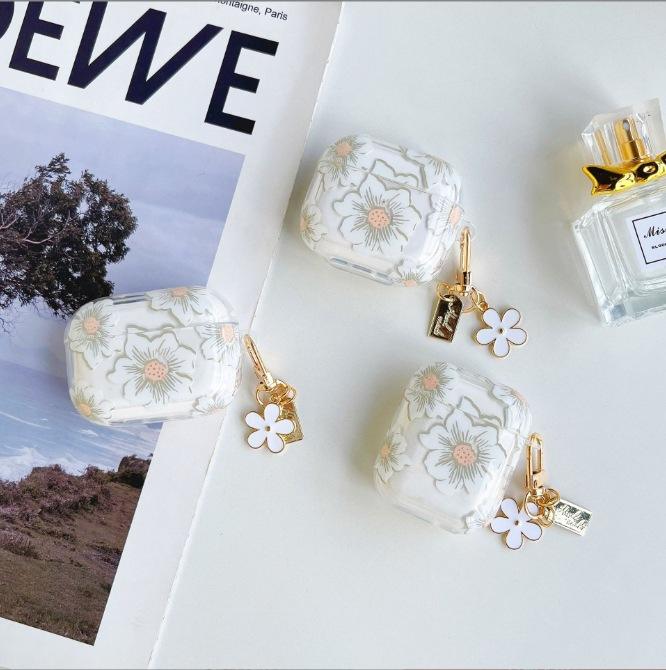 Black and white floral earphones case compatible with for AirPods Pro 2, transparent soft case with pendant