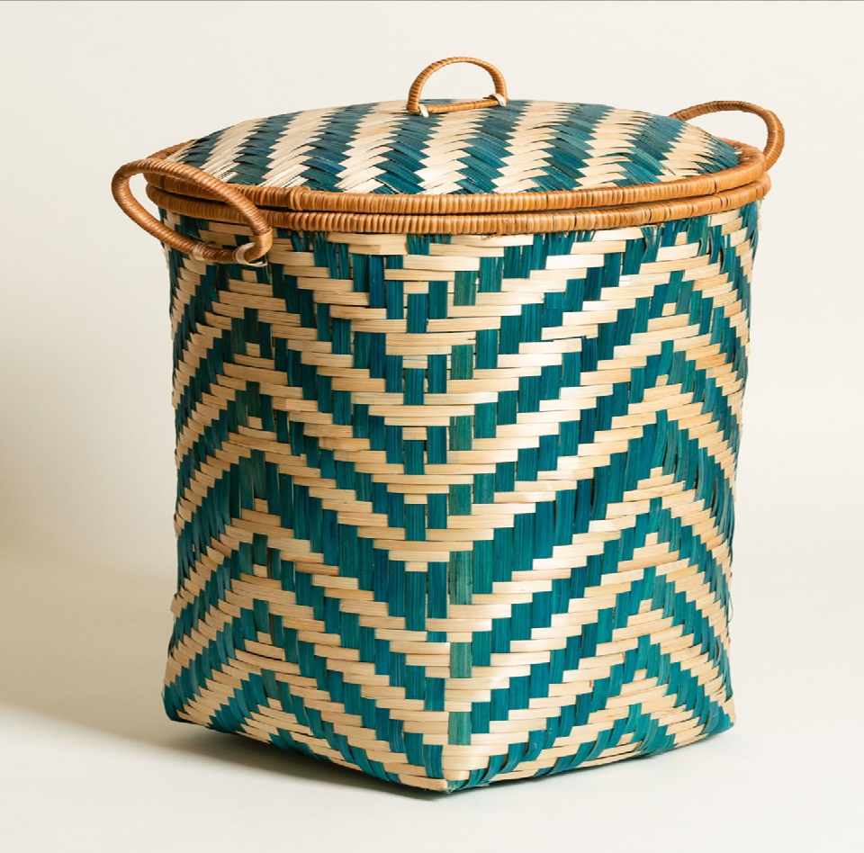 Black bamboo slatted laundry hamper with a rectangular shape and a removable liner. Available at wholesale prices.